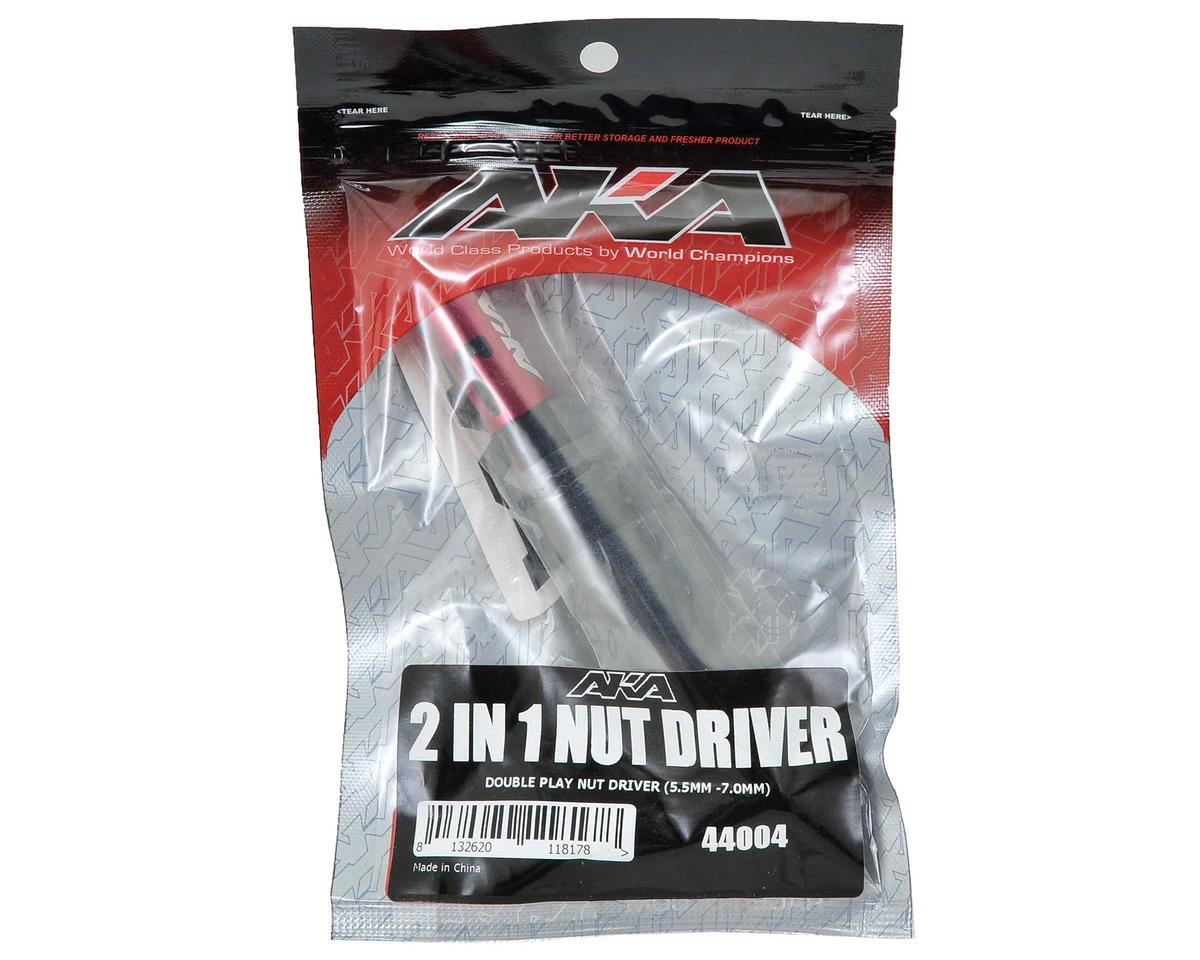This is the AKA Racing Double Play Nut Driver, with a 5.5mm and 7mm driver. The Double Play nut driver creatively lightens your toolbox by putting a 7mm and 5.5mm wrench in one! The 7mm driver fits metric wheel nuts found on most popular 1/10 buggies and short course trucks, while the 5mm driver is common for shock nuts and most nuts on metric 1/8 cars. The machined aluminum handle and sleeve provides weight reduction over standard steel tools with the added durability of a hard anodized finish.