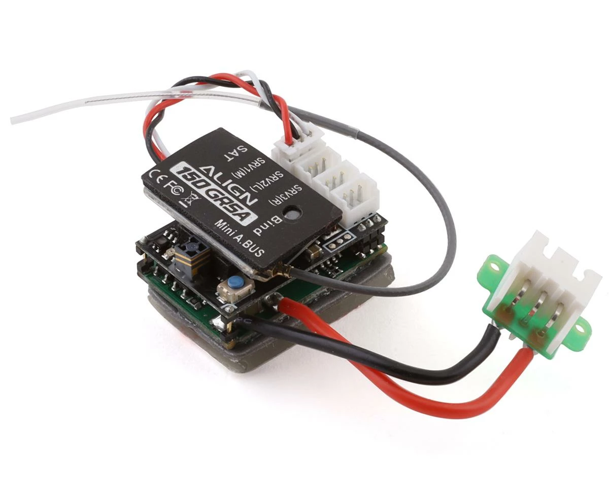 This is a replacement Align 150GRSA Flybarless System, A.Bus Receiver, and ESC unit. This replacement can be used with both the T-Rex 150 and T-Rex 150X helicopters. Users who are using the Align A10 radio system require this particular flybarless unit, as it is compatible with the A.Bus modulation that the A10 communicates with. Additionally Spektrum users can connect a compatible DSM2 or DSMX remote satellite receiver and bind it to their favorite Spektrum radio system.