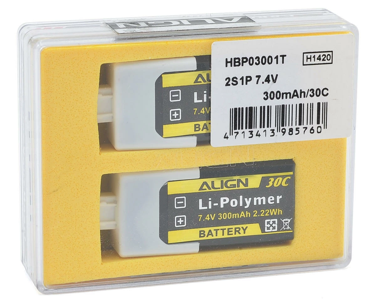 This is a pack of two Align 2S, 7.4V, 30C LiPo Battery. These batteries feature 300mAh of capacity.