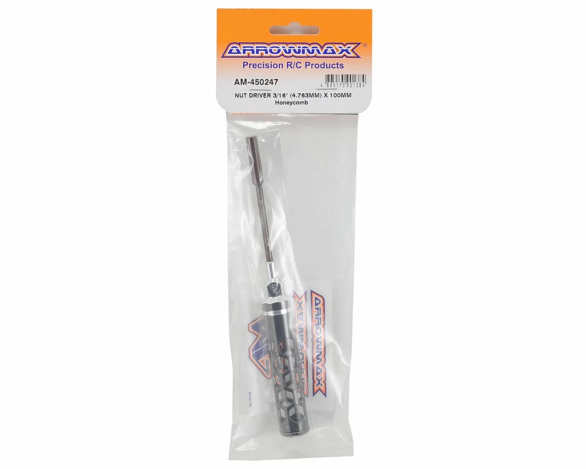 This is an Arrowmax 3/16″ Honeycomb Nut Driver. Arrowmax tools feature an eye-catching, light weight, hollow honeycomb handle design. The 100mm long tips are spring steel and titanium nitride coated for durability. When combined with the lexan cap, you get a comfortable, controllable and lighter feeling tool that makes wrenching easier.
