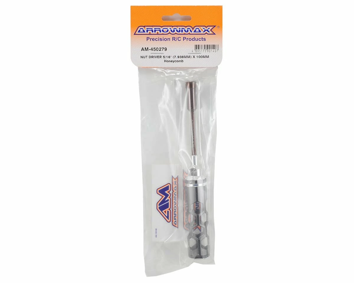 This is an Arrowmax 5/16″ Honeycomb Nut Driver. Arrowmax tools feature an eye-catching, light weight, hollow honeycomb handle design. The 100mm long tips are spring steel and titanium nitride coated for durability. When combined with the lexan cap, you get a comfortable, controllable and lighter feeling tool that makes wrenching easier.