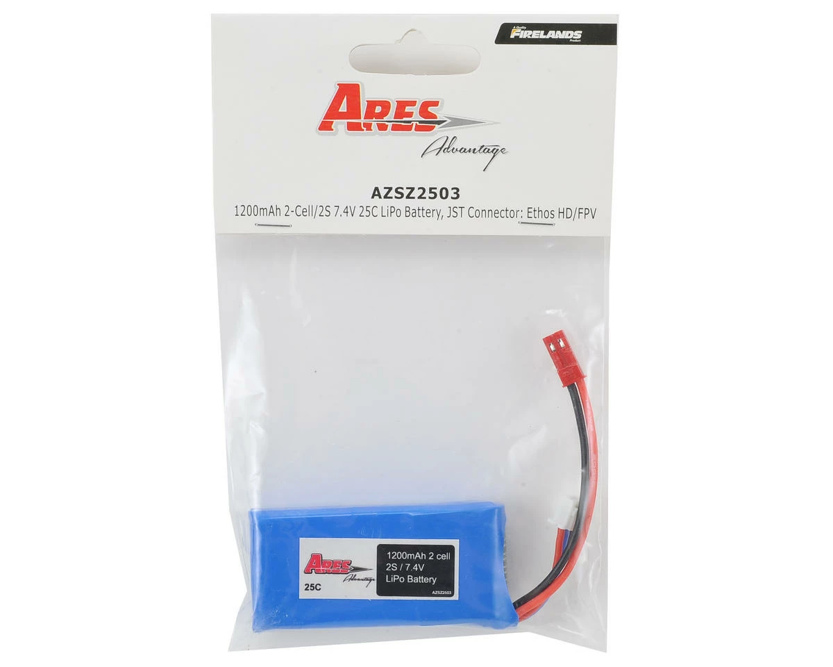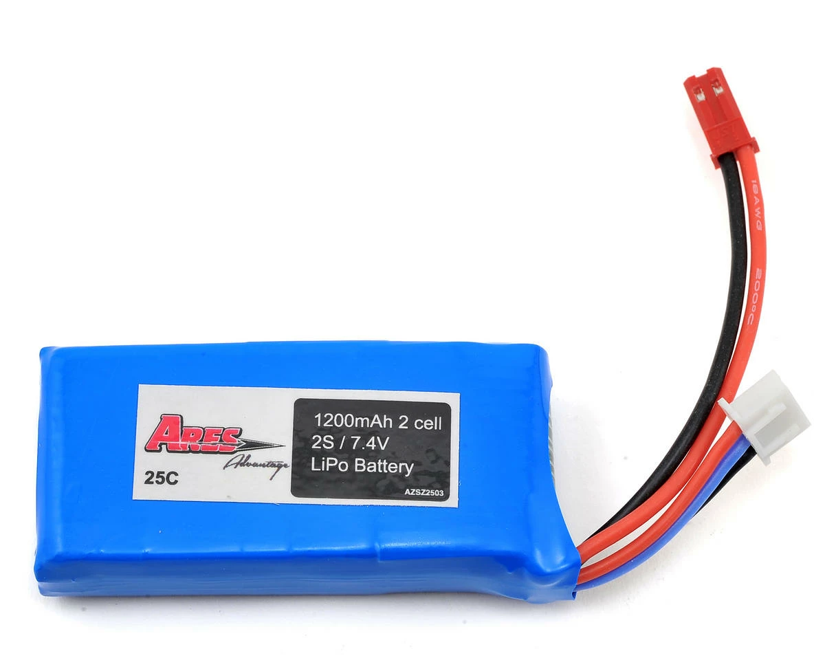 This is an Ares 25C LiPo Flight Battery with a JST connector. This battery is a 2S with 7.4 Volts and 1200mAh capacity.