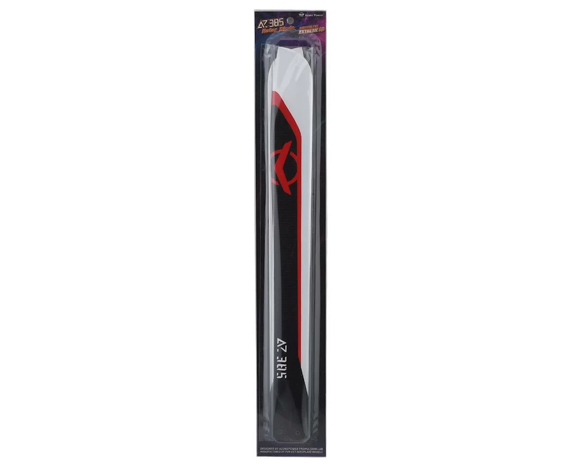 This is a Azure Power AZ385 385mm Carbon Fiber Main Blade Set, feature a unique design that has been carefully and repeatedly tested to best position the perfect propeller center of gravity. An excellent center of gravity increases flight stability while providing fast pitch response and precise control. In addition, the optimized design of the tip contour lowers overall noise levels. This updated tip reduces energy loss and reduces the speed changes when loaded. This means overall efficiency has been improved. The blade design features a non-uniform chord width across the entire blade. Combined with a unique airfoil, these aspects provide improved flight performance and smooth control.