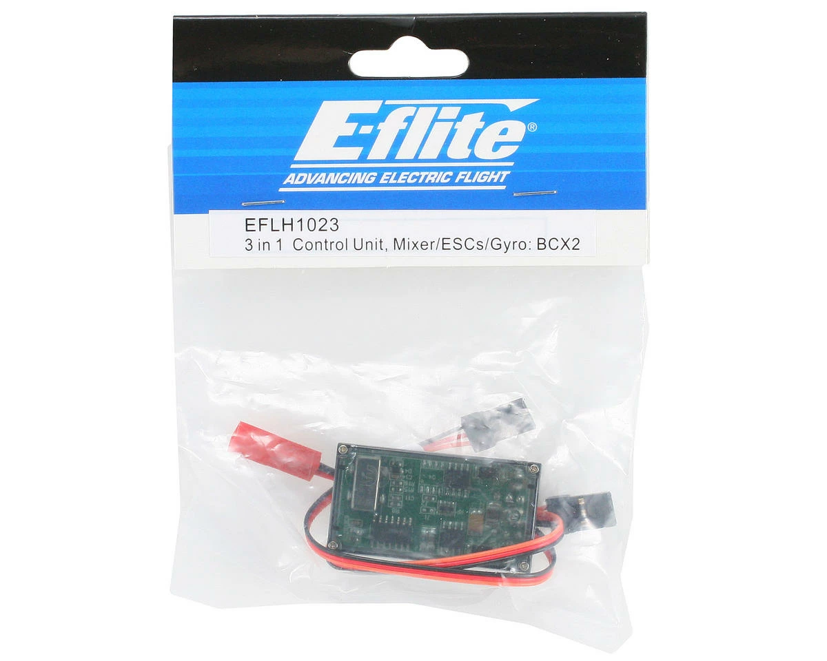 This is the E-flite 3-in-1 Control unit for the E-flite Blade CX2 helicopter. The 3-in-1 unit contains the 3 main electronic components needed to fly the heli. The mixer which controls the cylic servos, the speed controller which controls the speed of the motors (rotor blades) and the gyro unit which helps stabilize the tail.