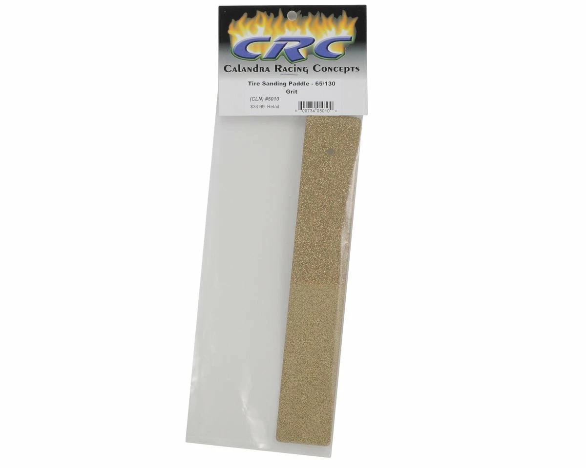 This is a 60/120 Grit Tire Sanding Paddle from Calandra Racing Concepts. Finally, no more having to use the wife’s nail files or a machinists metal file! The new CRC Tire Paddle gets the job done right, and with ease. The tire paddle has a coarse 65 grit on one end to round the edges on even the toughest rubber, such as purple front tires. Then flip it around and get the perfect finish with the 130 grit end. With this Sanding Paddle from CRC, tire truing has never been easier!