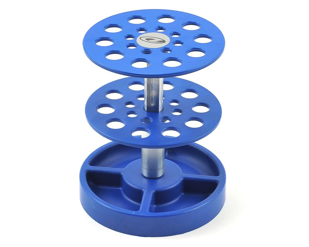 The Duratrax Pit Tech Deluxe Tool Stand is made from durable high-impact polystyrene with an aluminum center post, and features eighteen holes for screw drivers and other tools. The molded base has four compartments for keeping small parts, screws, etc. organized. To keep your workspace as clear as possible, the shock stand can also be disassembled and stored flat.