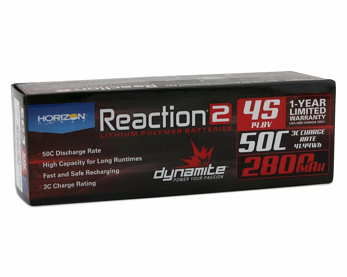 Dynamite Reaction 2.0 4S 50C LiPo Battery. This is a 4S, 2800mAh, soft case LiPo battery with an EC5 connector.