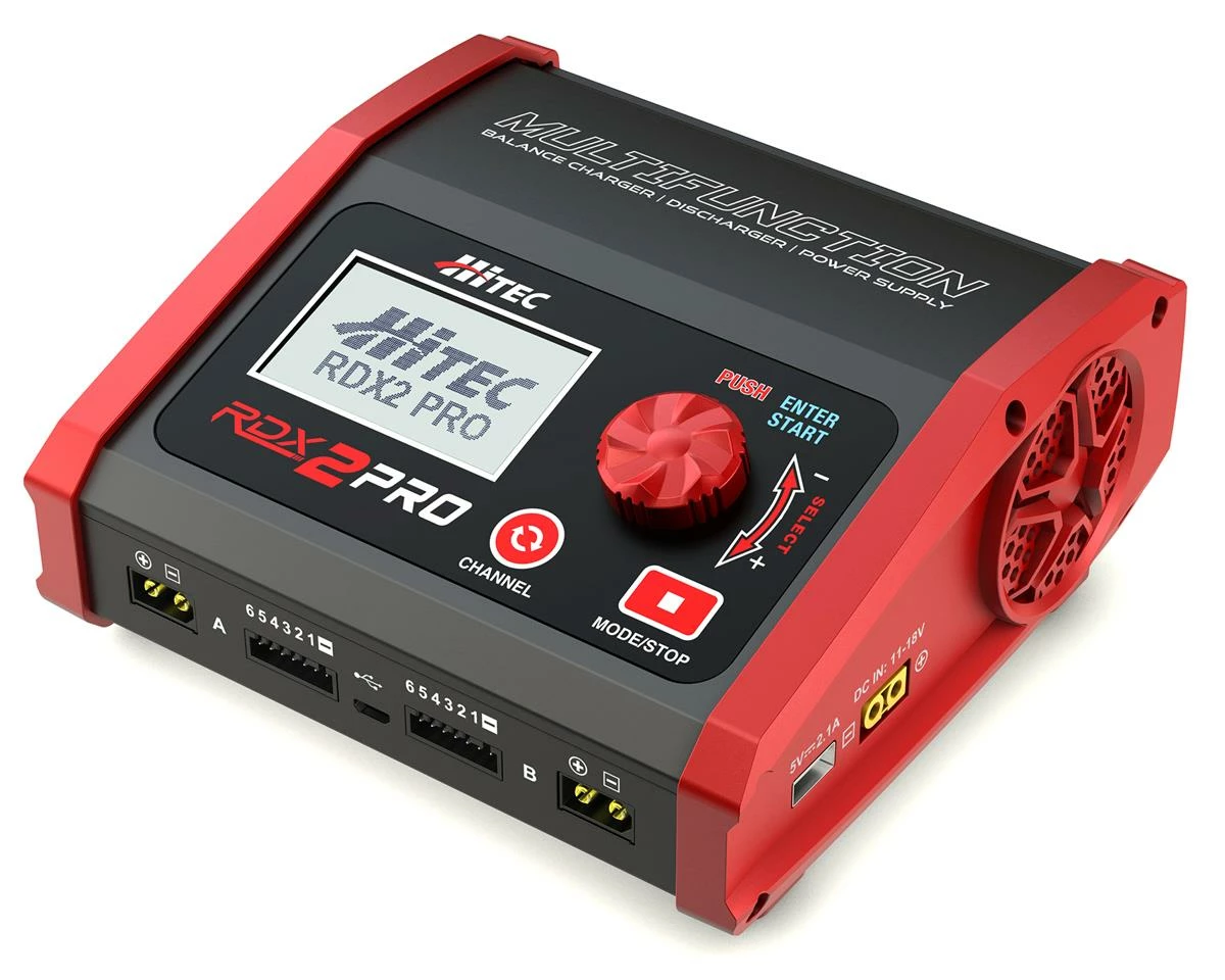 The Hitec RDX2 Pro AC/DC Multi Charger is a dual port AC/DC charger that delivers a whopping 260 watts of power! The RDX2 Pro features independent, 130-watt circuits, allowing you to charge two packs simultaneously. Its user-friendly Jog Dial easily scrolls through menus, making programming a breeze. Capable of charging 2S packs at rates up to 14 amps, and 4S packs up to 9 amps, the RDX2 Pro’s high charge rates provide more power in less time for your 1/8th and 1/10th-scale Buggy and Truggy needs.