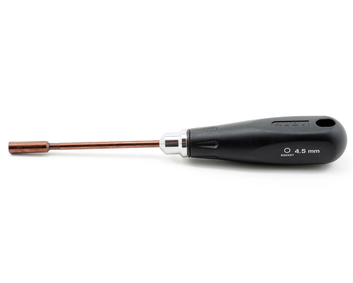 This is the Hudy 4.5mm profiTOOL Socket Driver. The HUDY profiTOOLS are based on highly-successful HUDY Professional Tools used by RC factory teams and world champions, and are available in most popular sizes and types. Each tool has a special, CAD-designed tip made of world-renowned HUDY Spring Steel(tm) to very precisely fit the corresponding fastener, allowing unmatched torque and long life. Lightweight, comfortable molded handles with machined hubs are designed to allow easy tip exchange.