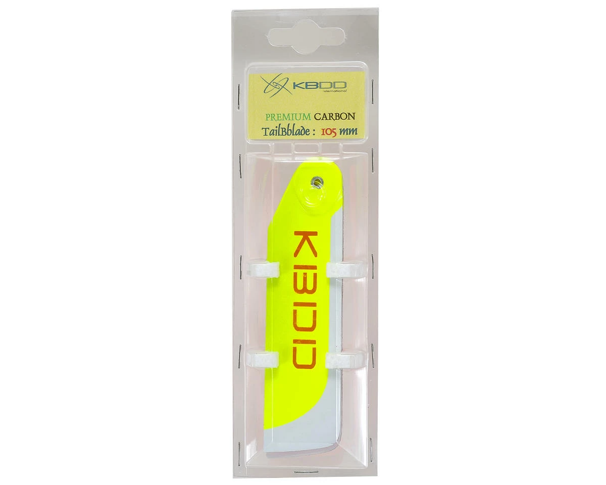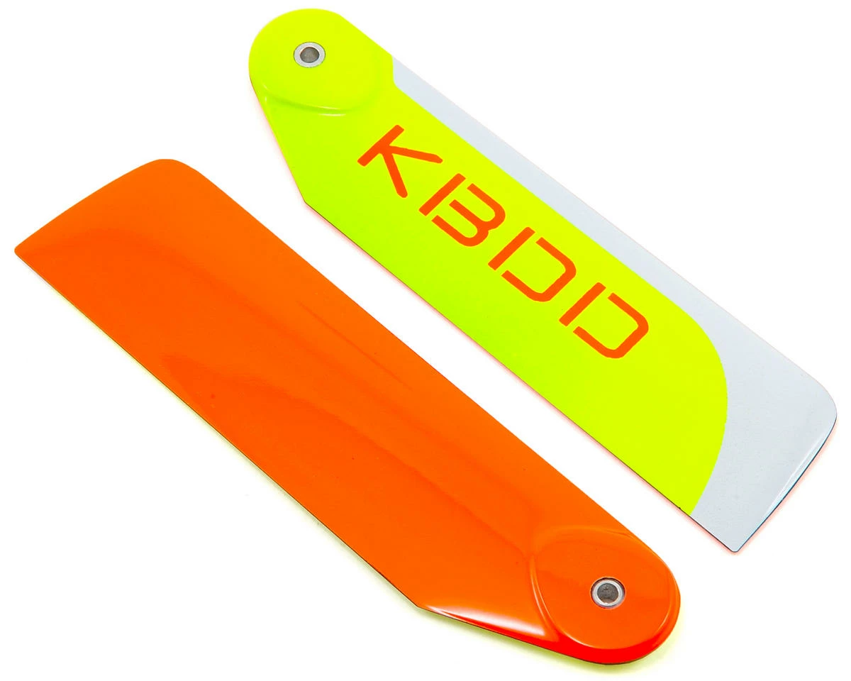 This is an optional K&B Dream Designs Extreme Edition 105mm Tail Blade Set, and is intended for use with 90 and 700 class helicopters. These extreme edition blades are made to be extremely strong and stiff to withstand the demands of high performance 3D flight. They feature an easy to identify yellow and white graphic scheme on one side, and are solid orange on the other side helping to maintain tail orientation while performing 3D maneuvers.