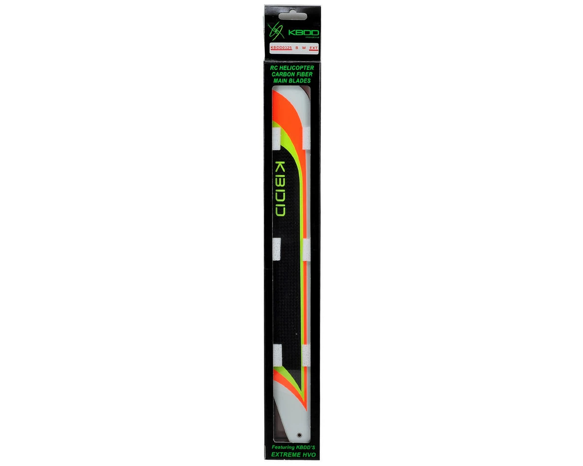 This is a KBDD International 325mm Carbon Fiber Extreme Edition Flybarless Main Blade Set. These Flybarless Carbon Fiber main blades feature a distinct orange/yellow/white color scheme that makes it easy to maintain orientation, and delivers a striking appearance that looks as good in the air as it does on the ground, with performance to match. For use with 450 size helicopters.Â