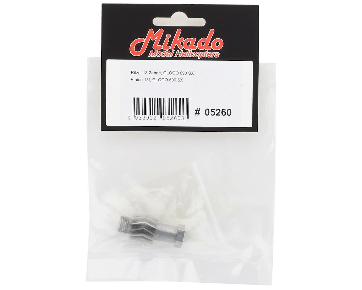 This is a replacement Mikado 13T Pinion Gear, suited for use with the Glogo 690 helicopter.Â