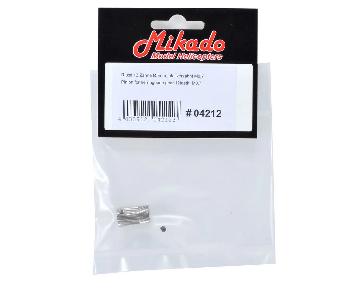 A replacement 12T M0.7 Herringbone Pinion Gear suited for use with the Mikado Logo series of helicopters. Supports 5mm Motor Shaft Diameters