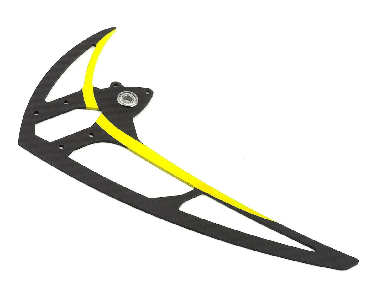 This is an optional Mikado Logo 600 Vertical Fin featuring a yellow painted accent.