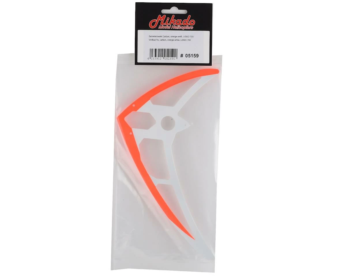 An optional Mikado Logo 700 Tail Fin, featuring a white and orange paint scheme.
