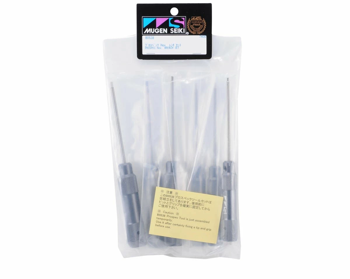 This is the Mugen ProSpec Allen Wrench Set. Featuring high quality CNC Machined, knurled handles and replaceable hardened steel tips. The handles on these tools are hollow to reduce weight and lessen fatigue, but also to allow the tips to be stored inside the handle to save space in your pit box.
