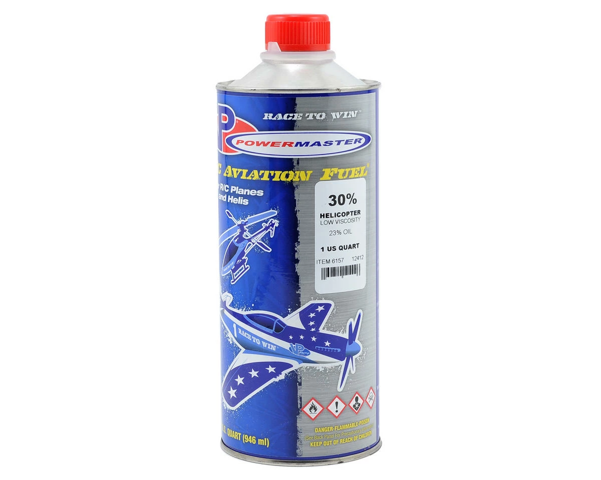 This is a one quart bottle of PowerMaster 30% Helicopter Fuel. PowerMaster Premium Heli Fuel is developed with a low-viscosity oil package combined with a technically-advanced extreme pressure additive package that eliminates bearing wear under any load. This high-performance lubrication package works extremely well for steel bearings and ceramics alike.