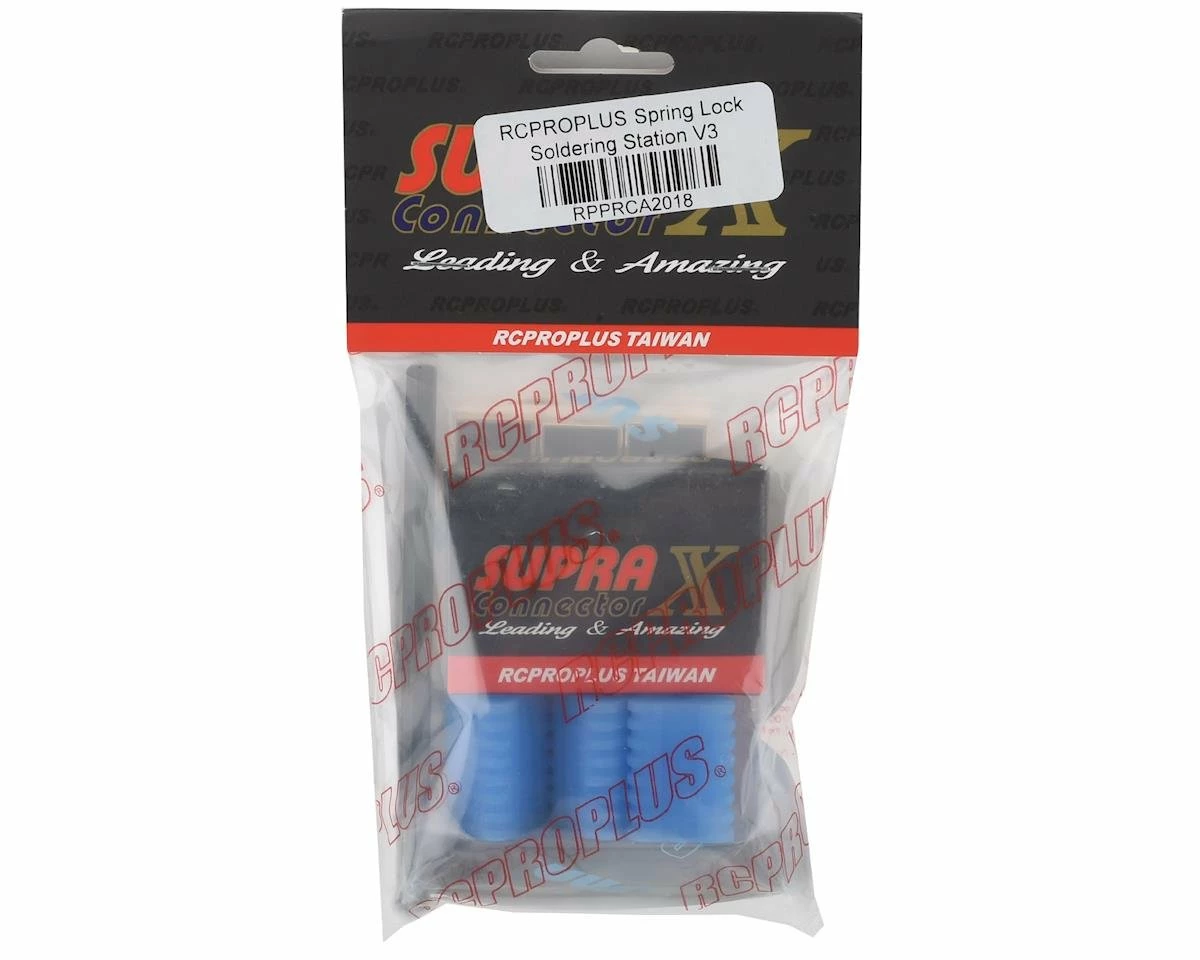 The RCPROPLUS RCA2018 Spring Lock Soldering Station takes the RCPROPLUS soldering station design to the next level. By replacing the alligator clips, with spring loaded locking elements you get a more secure hold on the item you are are trying to solder without damaging the shielding, along with the ability to hold 6 to 16awg size wire. Plus, the addition of thumb screws on the locking heads allow you to easily adjust the position of the head without the use of tools.