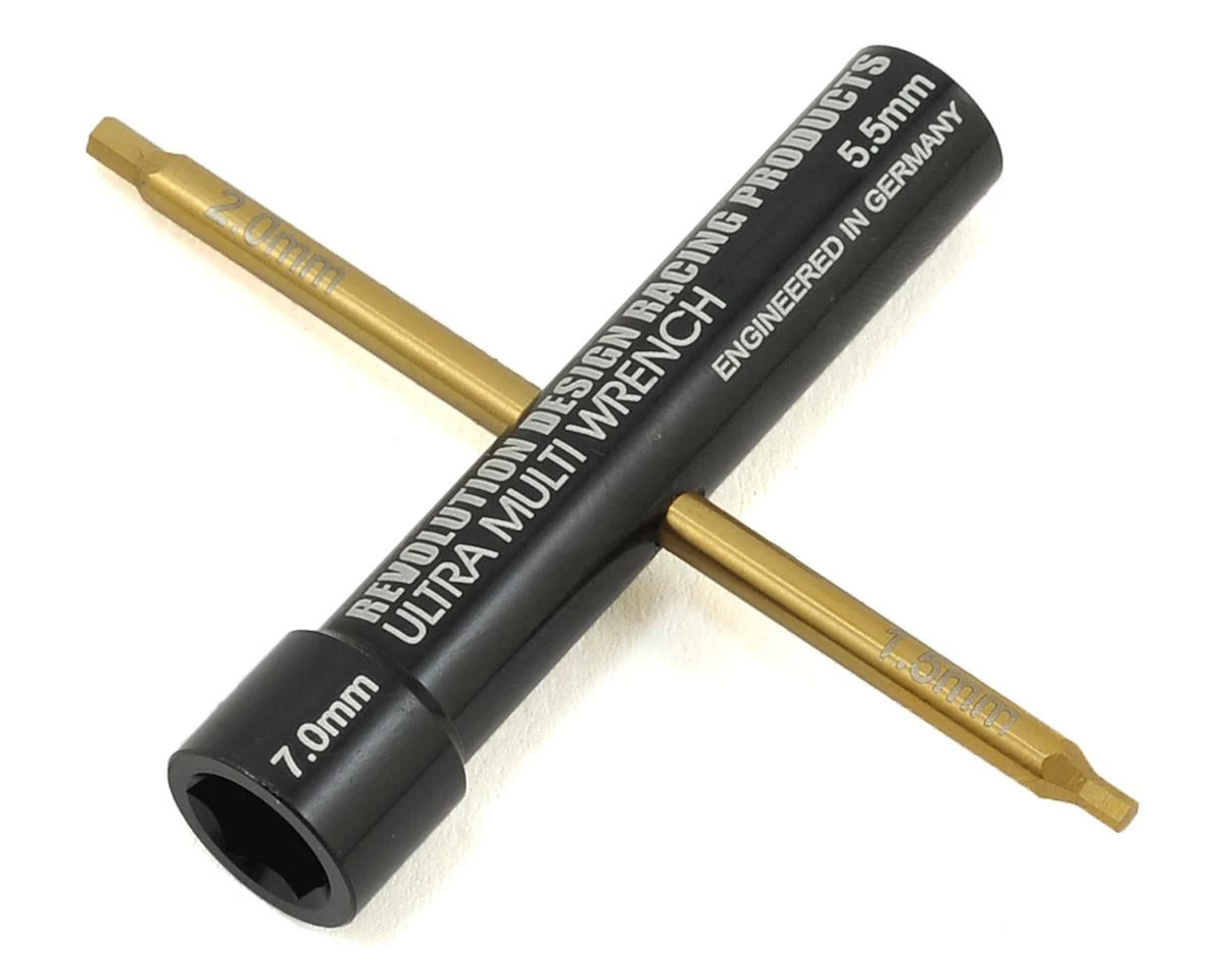 This is the Revolution Design Racing Products Ultra Multi Wrench. The ULTRA MULTI WRENCH is an innovative and unique cross wrench that includes a 5.5mm and 7.0mm socket wrench for M3 and M4 Nuts and also a 1.5mm and 2.0mm hex wrench for M3 Screws and M3 Set screws. RDRP created this wrench to cover most of the screws used by an electric racer, with one innovative tool.