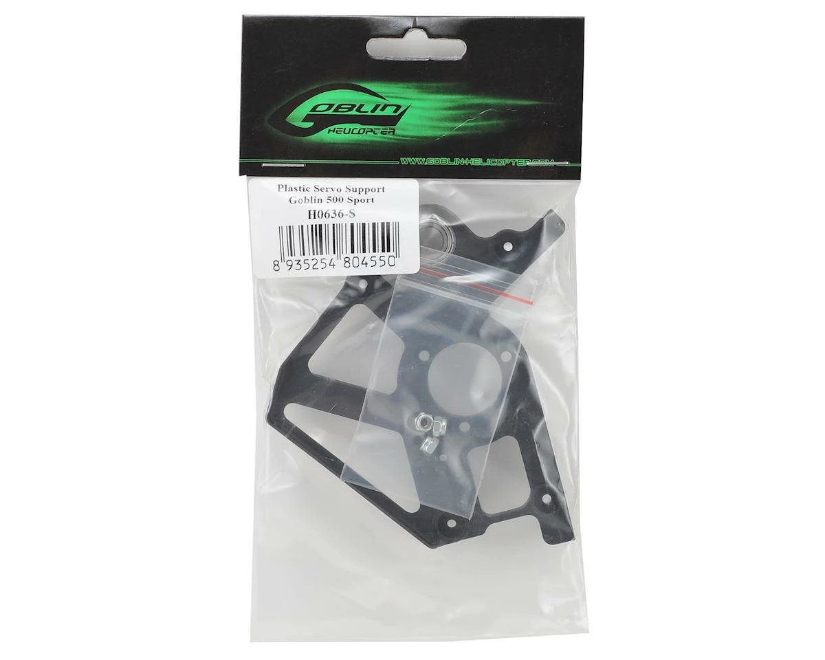 A replacement Plastic Servo Support from SAB, suited for use with the Goblin 500 Sport helicopter.