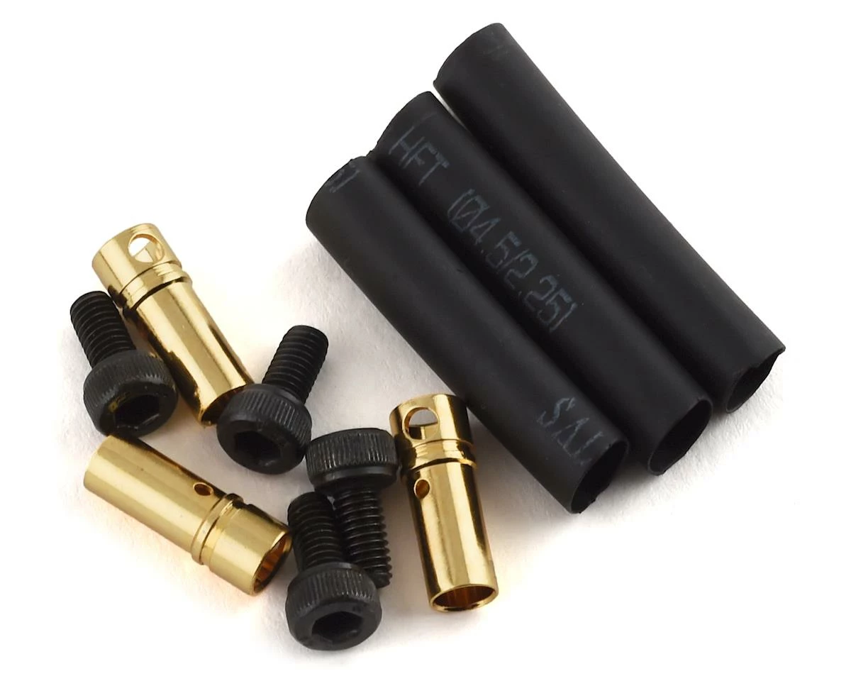 All Scorpion HK Series 22mm motors come with 3.5mm male Bullet style connectors already attached, and include a hardware package that contains three matching female Bullet connectors for your speed controller, heatshrink to cover the bullet connectors and mounting screws. Since the HK series motors are primarily designed for Helicopter and Ducted Fan use, they do not include a prop adapter. If running a prop on this motor, you will need to purchase a prop adapter for a 3.17mm shaft (1/8 inch).