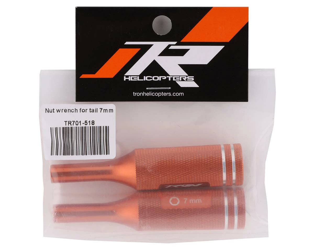 This is a pair of Tron Helicopters 7mm Nut Wrenches. These are used for the tail rotor grip assembly, which utilizes locknuts to secure the grips together on the tail spindle shaft. Due to the narrow grip design, these tools were specifically produced to ensure proper assembly and ease of repairs.