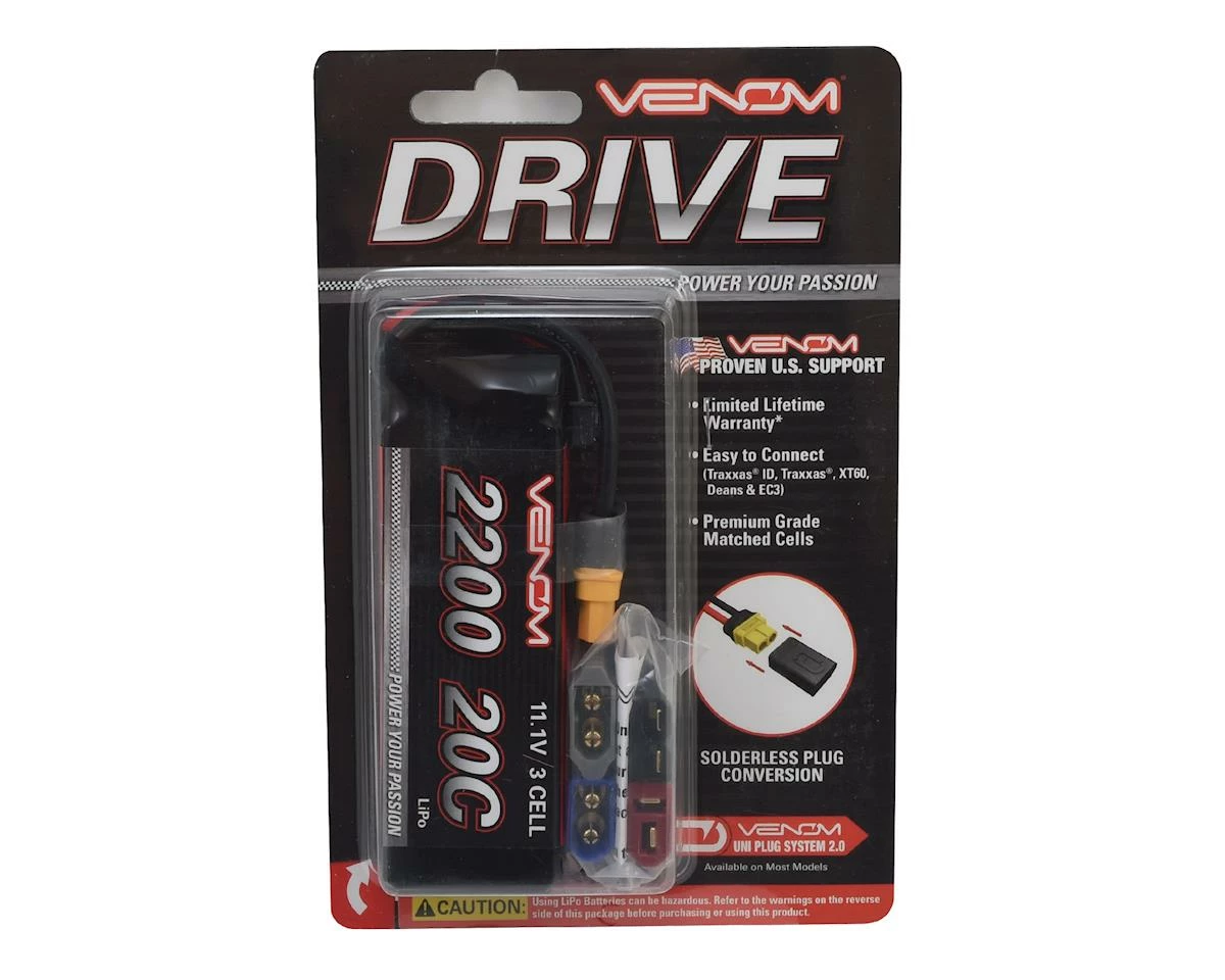 This Venom® 20C 3S 2200mAh 11.1V LiPo battery with UNI 2.0 is perfect for most 1/16 scale vehicles and RC rock crawlers and is built with Venom® Flak Jacket metal plates for added protection and durability. Venom® DRIVE batteries now also include the Venom® Universal 2.0 Plug System for the ultimate in connectivity. Utilizing a high current Amass XT60 base plug with the correct included Venom® UNI 2.0 adaptor for Venom® UNI 2.0 adaptor for Traxxas® legacy, Deans™ or EC3™ adaptor allows for solder-free plug conversion and plug and play use with todays most popular RC vehicles.