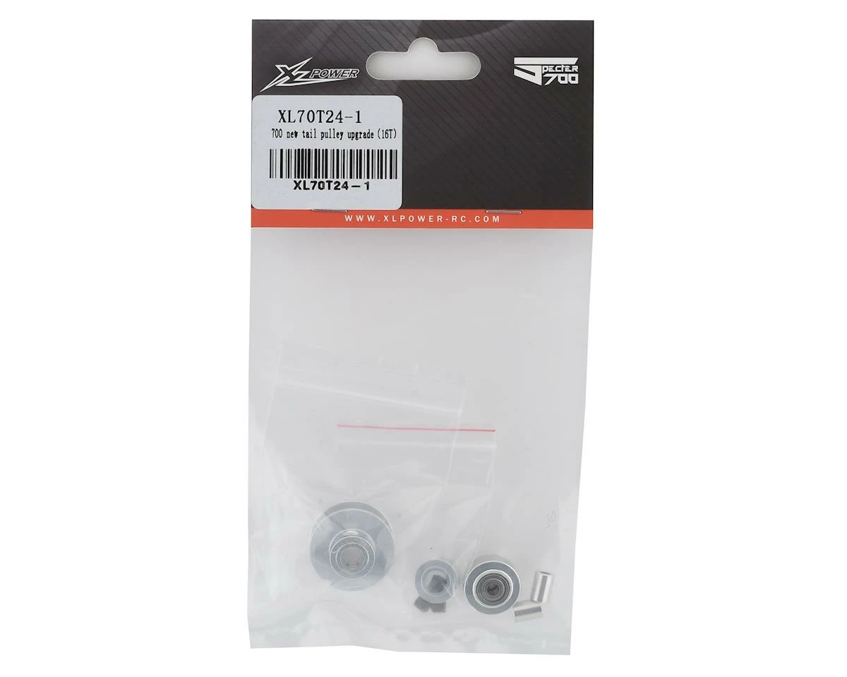 This is an optional upgraded XLPower 16T V2 Tail Pulley Kit. The V2 16t kit is a “speed up kit” providing higher tail rotor RPM. This upgrade kit provides improved belt support as well as smoother disassembly for ease of repairs and maintenance. Suited for use with the Specter 700 helicopter kit.Â