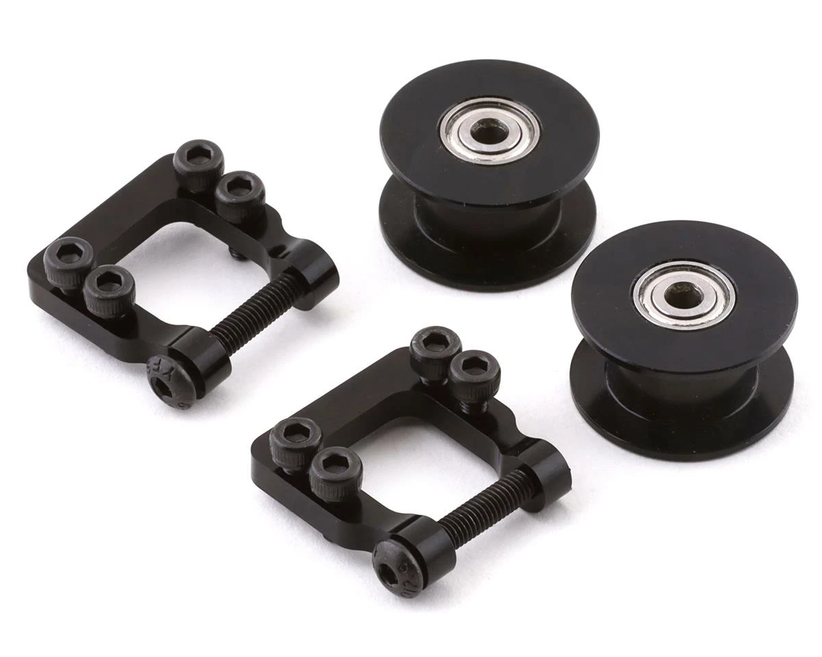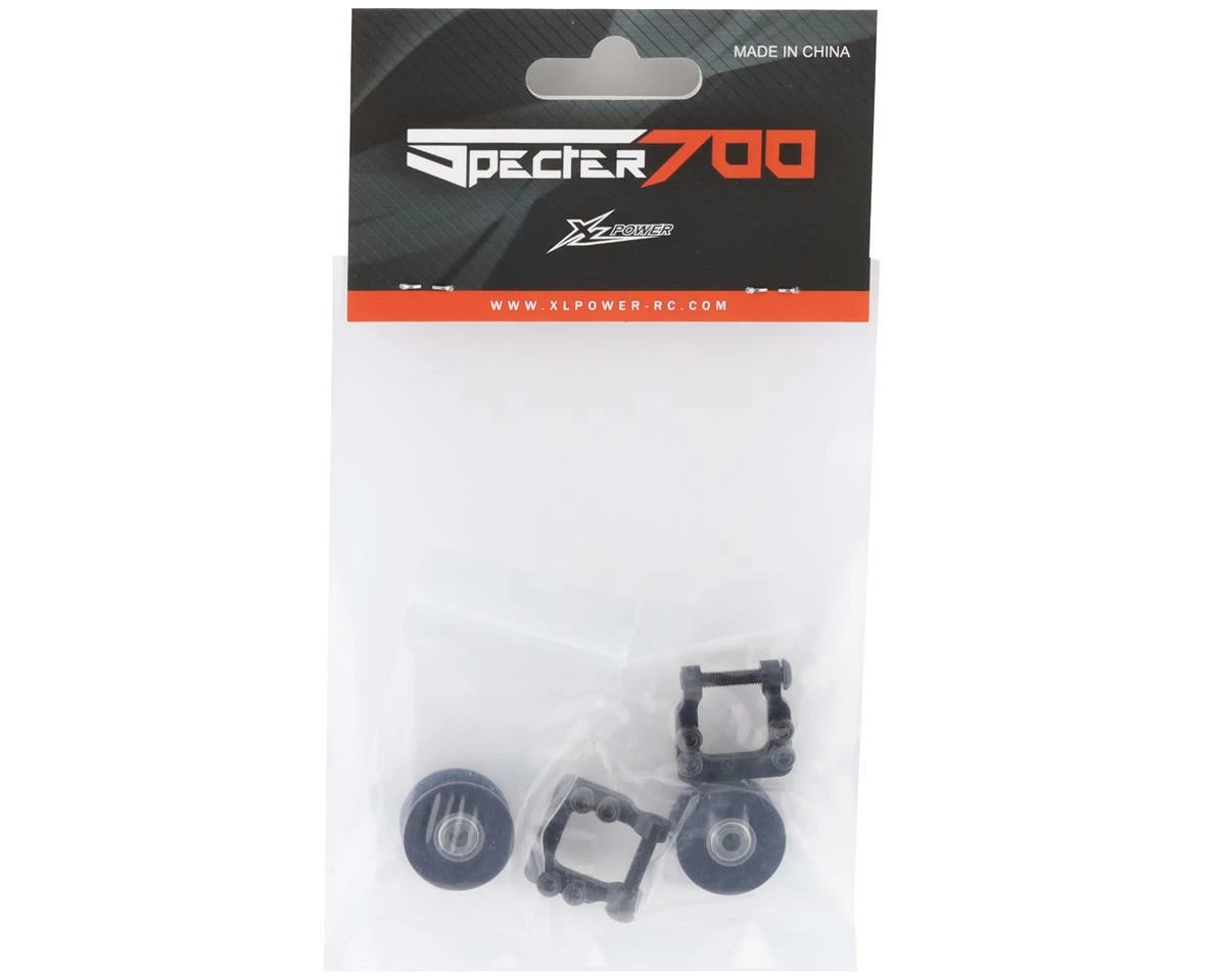 The optional XLPower Aluminum V4 Tail Belt Tensioner is the latest front tensioning system for the Specter 700. Regardless of what belt you are running (original 6mm, or upgraded 8mm), this version allows pilots to use either belt to help reduce any confusion when ordering parts. In addition to that, it is an upgrade over the original which aids bracing in the carbon fiber frame to reduce the chance of frames breaking in a crash near this area.